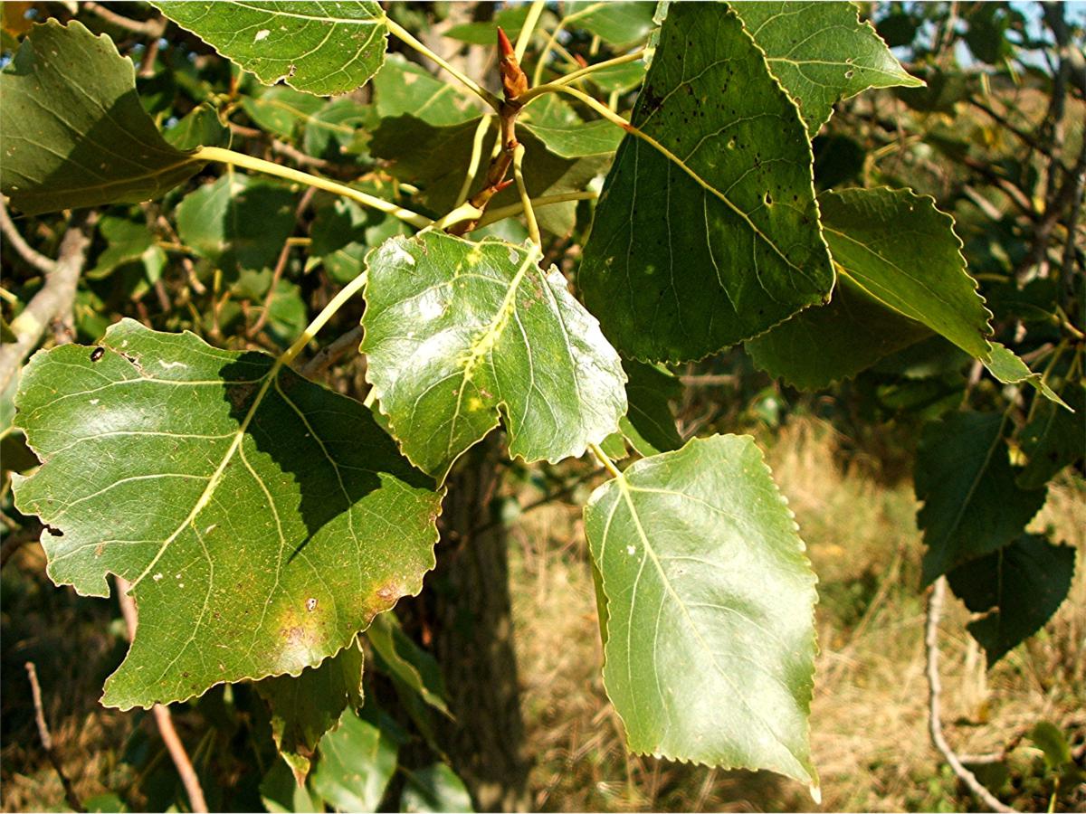 - Листья: Треугольные, тёмно-зелёные, осенью приобретают золотистый оттенок